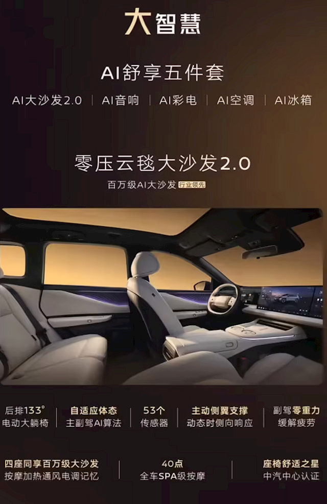 配有95L机动前备箱(纯电版)、773L大双层后备箱,pg电子同期还提供备受好评的零压云毯大沙发2.0,后排角度133°,全车带有40点SPA级推拿,此外还配备25扬声器环绕音响,支撑杜比全景声,以及-6°C-55°C冷暖双用雪柜。