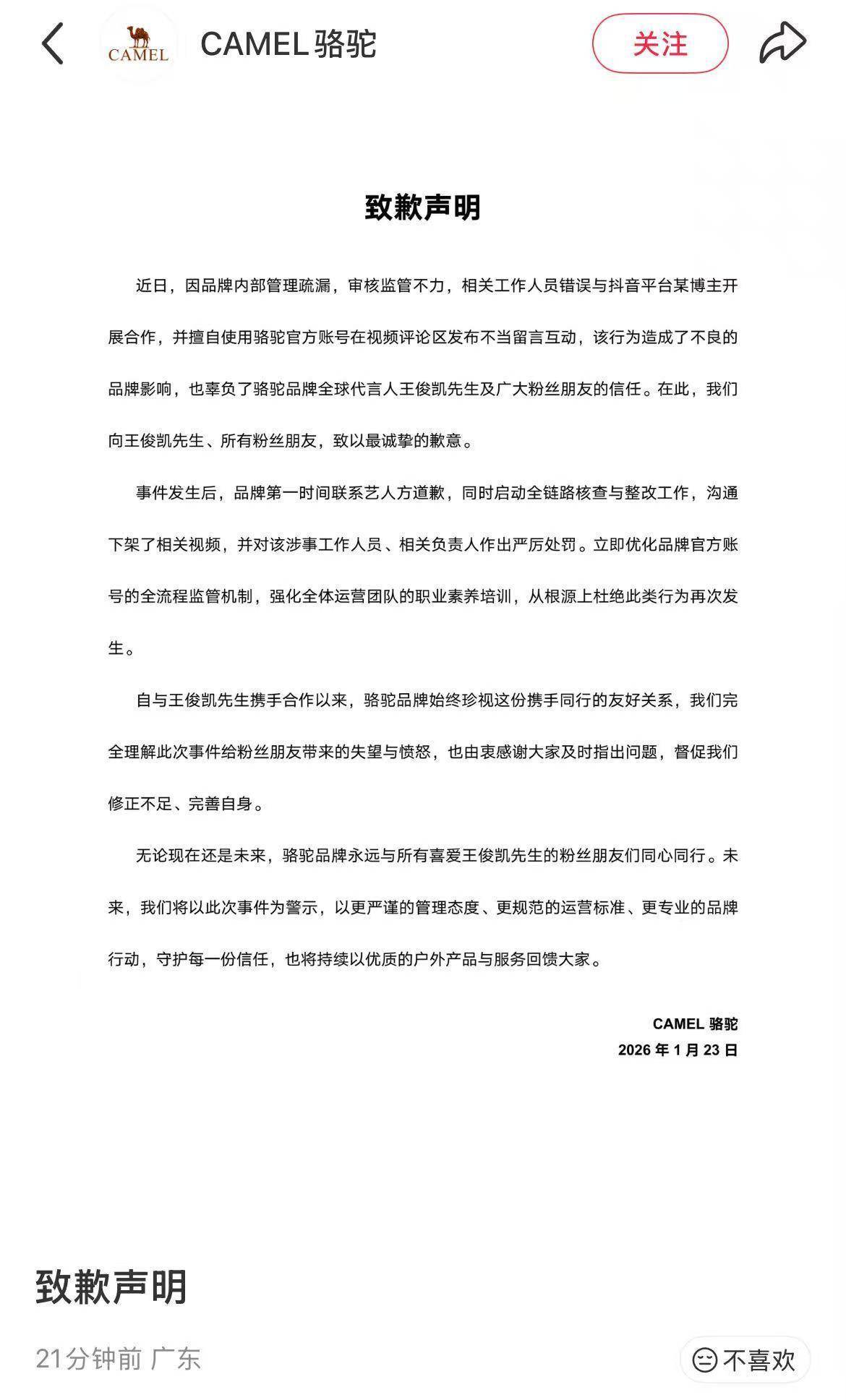 1月23日,品牌CAMEL 骆驼发布《致歉声明》,全文如下: