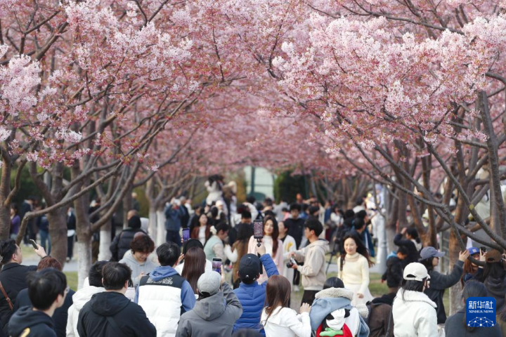 3月16日,东说念主们在浙江省宁波市鄞州区文化广场不雅赏通达的樱花。春风顺心,柳宠花迷,东说念主们踏青赏花,享受好意思好春光。新华社发(胡嘉捷摄)