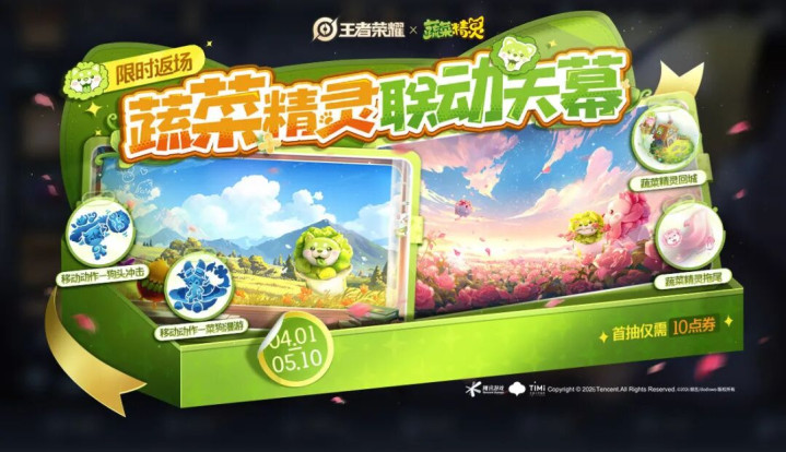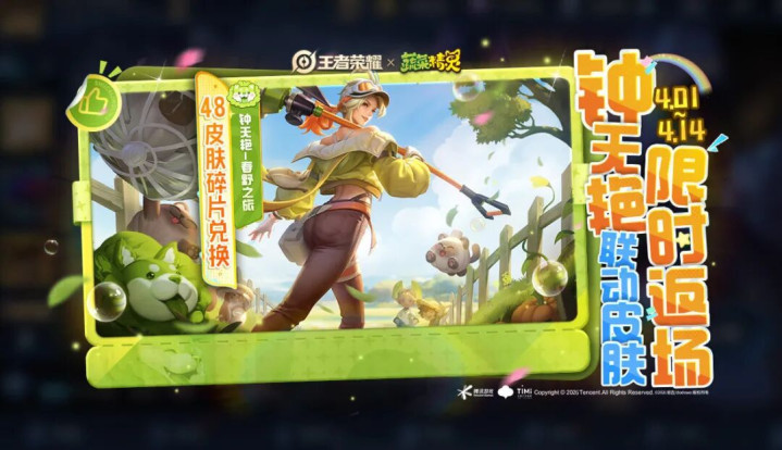 另外,还有蔬菜精灵的联动返场,包括钟无艳的勇者皮肤【春野之旅】,以及蔬菜精灵的联动天幕。