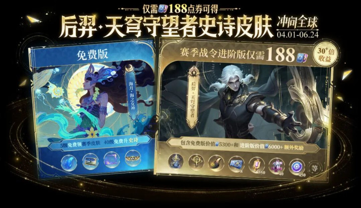 可是还有没提到的实质。那便是新一期的战令皮肤,其实早就猜到了,但崇拜爆料如故被放到了新赛季更新前的终末一天。这一期的战令,名为“冲向全球”。说白了便是,这两款皮肤来自王者荣耀国外服。其中战令进阶的史诗皮肤是后羿的,名为【苍穹盼愿者】,而勇者皮肤是海月的,名为【海之女神】。海月的海之女神可以在战令40级的本领升级为史诗品性。