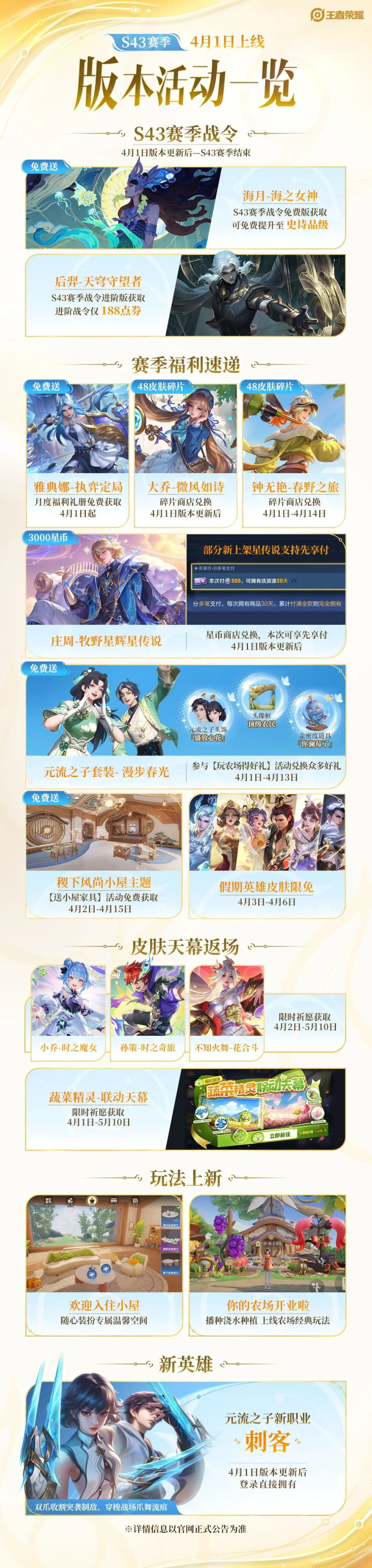 4月1日,王者荣耀将迎来S43赛季的崇拜更新。具体的实质,差未几齐鄙人面这个图内部了。而大部分,这几天齐也曾提到过了。