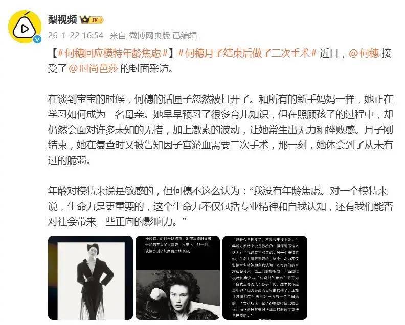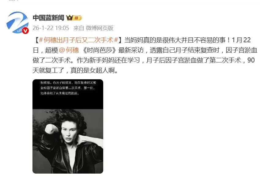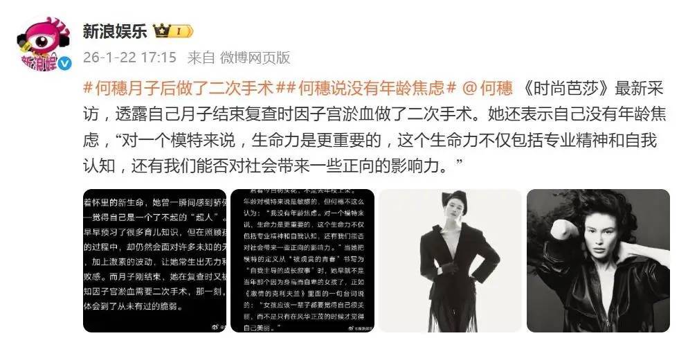 据1月22日报说念,超模何穗一句“体会到了从未有过的脆弱”,揭开了产后姆妈光环之下不为东说念主知的身心挑战。在《前卫芭莎》最新专访中,她初度详备清晰了我方在月子放荡后因突发健康问题袭取二次手术的资历,这段历程重复育儿压力,让她一度堕入无力与挫败。可是,谈及模特行业最明锐的年纪话题,她的回答却展现出判然不同的清晰与力量。