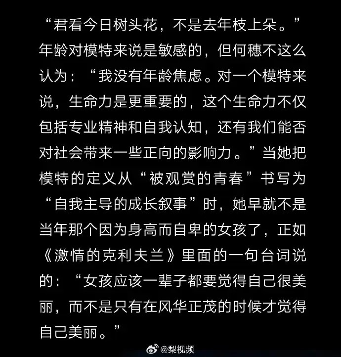 可是,当话题从母亲自份转向她的本职——模特行业时,何穗的姿态却从采选脆弱转向了无比坚忍。面临这个对年纪数字极其无情的限度,她快东说念主快语地暗示:“我莫得年纪泼辣。” 在她看来,关于一个模特而言,比芳华更迫切的,是生命力。